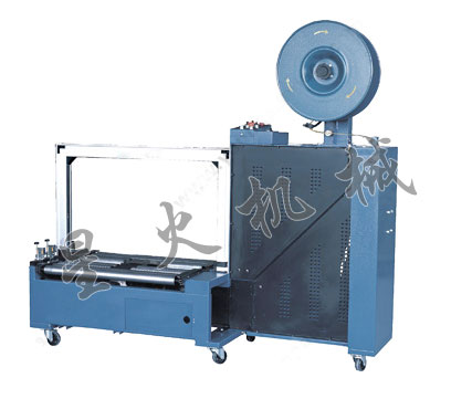 該打包機工作原理:打包物體基本處理機器中間,首先右頂體上升,壓緊帶的前端,把帶子收緊捆在物體上,隨后左頂體上升,壓緊下層帶子的適當位置,加熱片伸進兩帶子中間,中頂刀上升,切斷帶子,最后把下一下捆扎帶子送到位,完成一個工作循環。